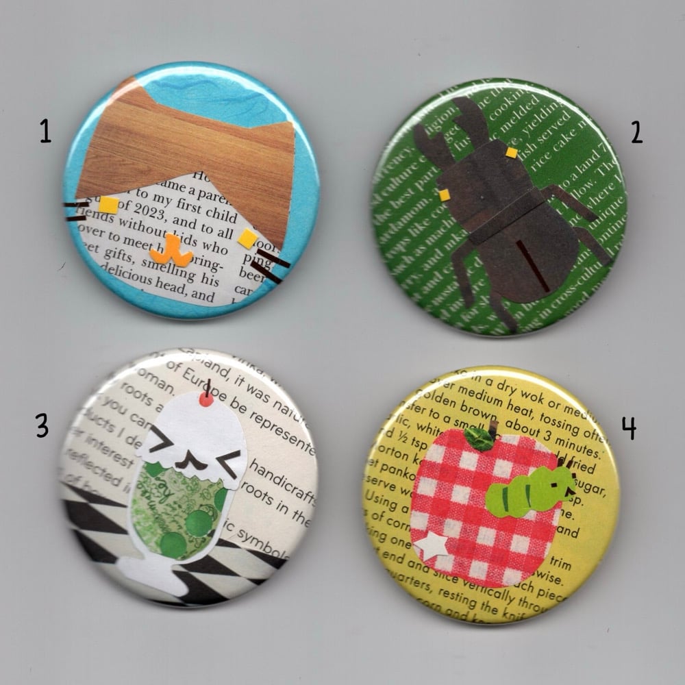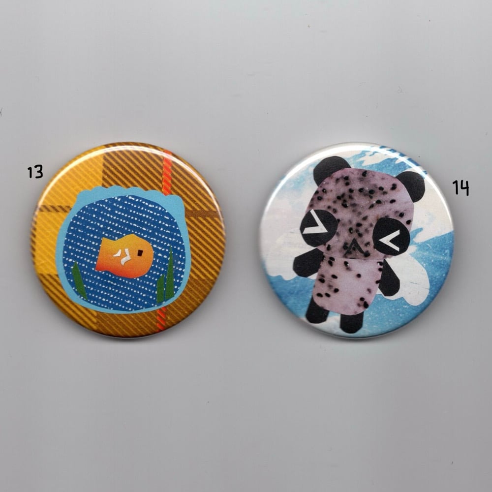 teensy tiny handmade collages made into buttons!! each pin holds an original tiny collage so each pin is one of one meaning it's completely unique :•)