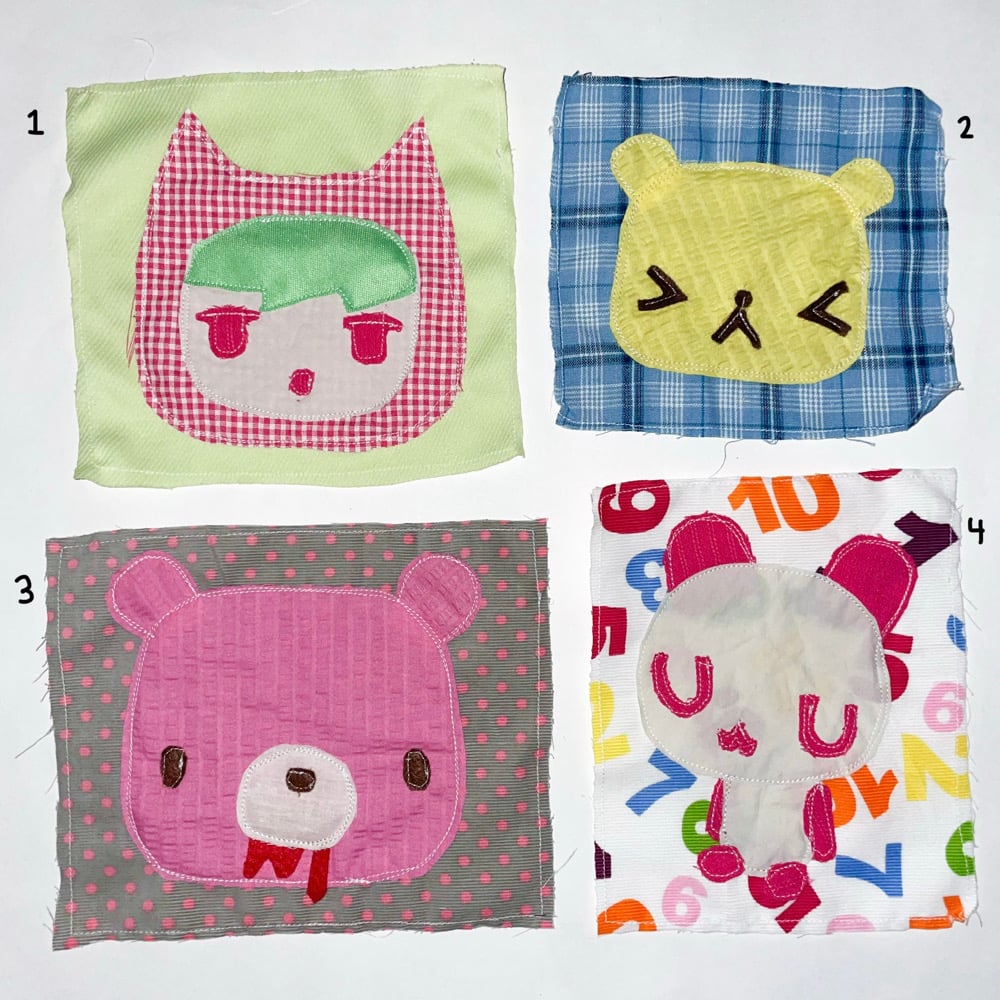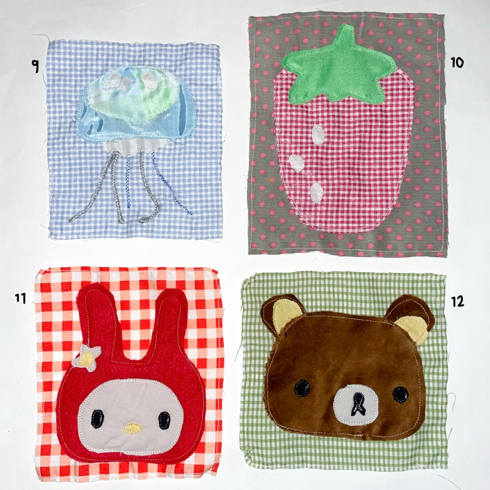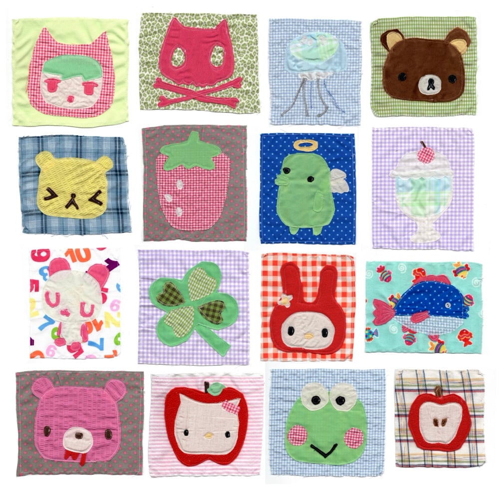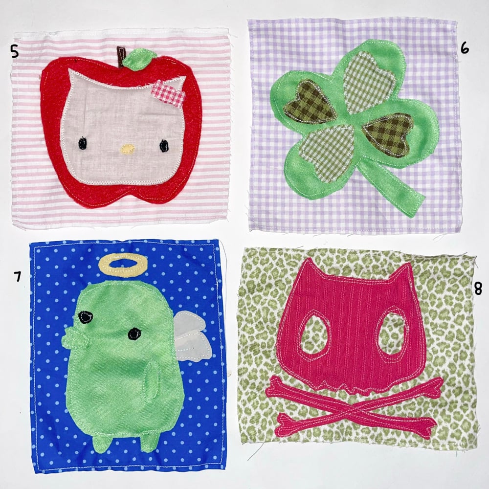 made with all secondhand fabric!! can be sewn onto bags + clothes + etc. or pinned on using safety pins :-) measurements all in inches: 1. 6.5x7 2. 6x5.5 3. 7x6 4. 6x7 5. 6.5x6 6. 6.5x6,5 7. 6x7 8. 7x6 9. 5.5x6.5 10. 6x8 11. 5.5x6.5 12. 6x6.5 13. 6.5x7.5 14. 7x5.5 15. 7x6.5 16. 5.5x6 17. 5.5x5.5
